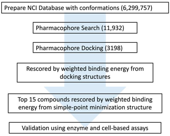 Virtual screening (VS) is a useful technique for identifying drugs by screening small-compound databases to determine if active inhibitors or novel scaffolds, which have been applied in many studies [13,14,15,16]. Structure-based VS calculates the binding free energy or considers the features or shape of the ligand binding site. Generally, docking, structure-based pharmacophore, and molecular dynamics (MD) simulations are the approaches used in structure-based VS For a structure-based pharmacophore, the researcher builds a pharmacophore model based on the shape or features of a protein for database screening; this approach has been successfully utilized in several studies [13,17]. In general, the VS hit rates and high throughput screening rates are 1–40% and 0.01–0.14%, respectively. The common activity cutoff in VS is 1–25 μM, and using a value of less than 1 μM is rare [18]. Although VS can identify potential compounds and decrease the cost of experiments, determining the affinity of compounds of less than 10 μM still presents a challenge.