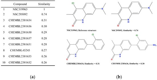 The similarity of screened compounds NSC319963 and NSC295092. (a) The structure similarity of NSC319963, NSC295092 and know TNKSs inhibitors. (b) The most similar compounds and their structures.