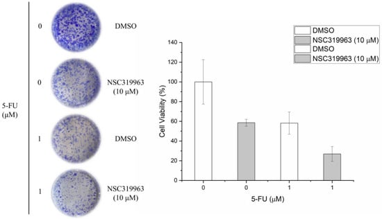 NSC319963 enhances the chemosensitivity of 5-FU in DLD-1 cells. DLD-1 cells were treated with different concentrations of NSC319963 and 5-FU for 12 days. Colony formation was counted and presented as bar graphs. Each column represents the mean ± SD with triplicate experiments.
