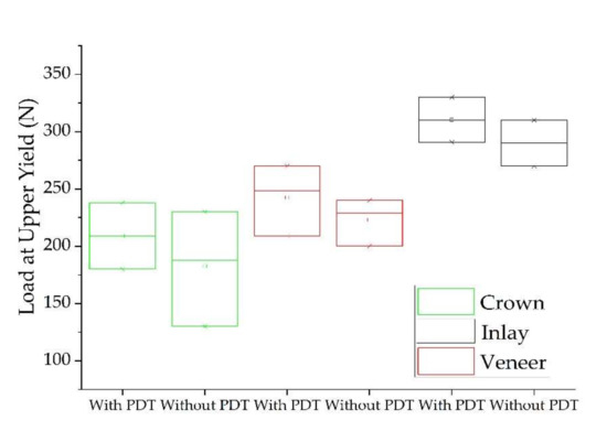 | Veneer | With PDT | 248.43 ± 20.9848 a | 79.079 ± 7.64638 c | 248.43 ± 35.0042 d |