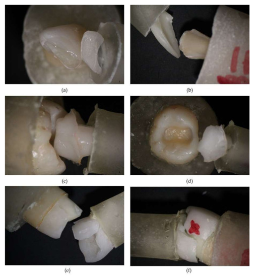 - Heintze, S.D. Crown pull-off test (crown retention test) to evaluate the bonding effectiveness of luting agents. Dent. Mater. 2010, 26, 193–206. [Google Scholar] [CrossRef]
