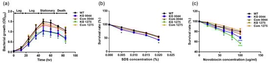 3.3. HP00044/HP1275 Gene Disruptions Affect Bacterial Growth, Sensitivity to the Detergent SDS and Resistance to the Antibiotic Novobiocin