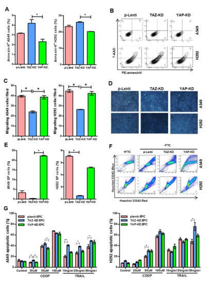 Treatment of lung cancer cell lines with conditioned medium from TAZ- or YAP-KD EPCs. Confluent NCI-A549 and H292 cell lines were exposed with a conditioned medium from EPCs for 24 h. Apoptosis detection (A,B), cell migration (C,D), and side population (E,F) were determined by annexin-V/7-AAD staining, Transwell assay, and Hoechst exclusion in the presence and absence of fumitremorgin C (FTC), respectively. A549 and H292 lung cancer cells cultured in an EPC-conditioned medium were treated with cisplatin (CDDP) and TRAIL, the apoptosis inducers, at indicated concentrations for 24 h. Apoptotic lung cancer cells were counted by Hoechst 33,342 staining of cells that have condensed or fragmented nuclei (G). All experiments were performed three times independently with technical duplicates, and data were expressed as mean ± SEM. * p-value < 0.05; and ** p-value < 0.01.