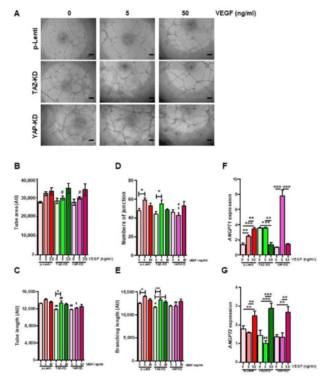VEGF rescued tube-forming ability of KD-EPCs. 10,000 EPCs were seeded on Matrigel-coated wells of 96-well plate in quadruplicates and let to form the tube-like structure for 12 h in the absence or presence of VEGF at the indicated concentrations. Several angiogenic parameters were quantified by ImageJ software (A–E). The expression levels of ANGPT1 and ANGPT2 in the VEGF-treated EPCs were determined by qRT-PCR (F,G). * p-value < 0.05; ** p-value < 0.01; and *** p-value < 0.001; # p-value < 0.05, and ## p-value < 0.01 (TAZ-KD and YAP-KD vs. pLenti at the same dose of VEGF); $ p-value < 0.05 (YAP-KD vs. TAZ-KD at the same dose of VEGF).