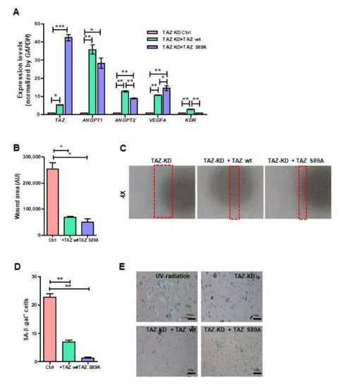 Rescue endothelial cell functions by ectopic expression of TAZ. TAZ-KD EPCs were nucleofected with wild-type or mutant S89A TAZ plasmids. mRNA of endothelial cell-related genes was quantified by RT-qPCR (A). Migration was measured by scratch-wound assay (B,C). Senescence cells were scored by enzymatic detection of positivity of β-galactosidase activity (D,E). All experiments were performed three times independently with technical duplicates, and data were expressed as mean ± SEM. * p-value < 0.05; ** p-value < 0.01; and *** p-value < 0.001.