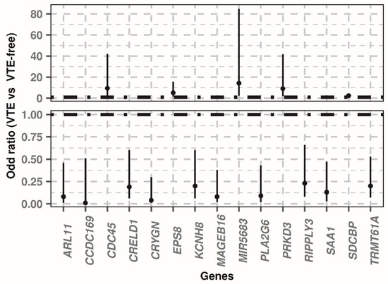 | Gene Expression | p-Value 1 | Odd Ratio (VTE 4 vs. VTE-Free) 2 | Lower | Upper |