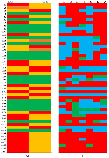 Serum of L rats contained a significantly higher average height in 20 peaks compared to O rats (Figure 1A). The highest peaks in the L group were distributed randomly across the chart until peaks 44 through 50, among which L rats showed stable dominancy over O rats. In contrast, O rats developed significantly higher average peak intensity in only 8 peaks that were distributed randomly across the chart. There was no difference in average peak intensity in 22 positions, which included three peaks in which the differences were on the margin of significance (0.1 > p > 0.05).