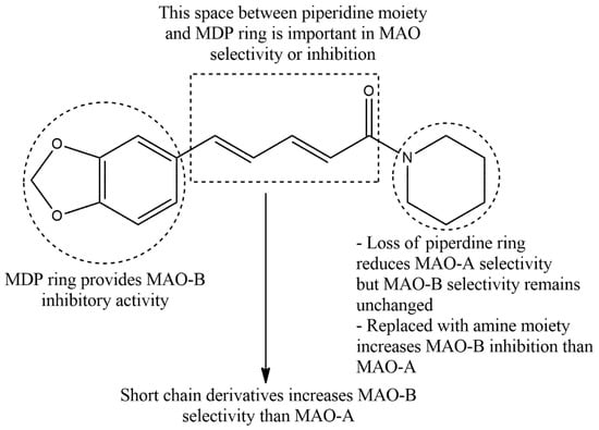 Consistent with Figure 3, a recent study has synthesized PIP-based derivatives by hydrolyzing PIP to piperic acid and analyzed their activity of MAO-A and MAO-B inhibition by a continuous fluorometric assay combined with computational docking [35]. The author showed that the replacement of the piperidine ring with a bulk aromatic ring increased the specificity and affinity of MAO-A inhibition owing to the presence of a large hydrophobic substrate cavity in MAO-A. Contrarily, replacement of the piperidine ring with a small amine moiety improves MAO-B selectivity and inhibition rather than MAO-A. Moreover, several apolar loops exist at the proximity of the C-terminal helix of MAO-B that facilitate additional membrane-binding via hydrophobic interactions and control opening and/or closing of the active site [36]. On the other hand, the MDP moiety showed affinity to form a side chain with polar residues like Thr314, Thr201, Ser200, and Thr202 at the MAO-B active site, and that hydrophobic interaction selectively increases MAO-B inhibition [35].