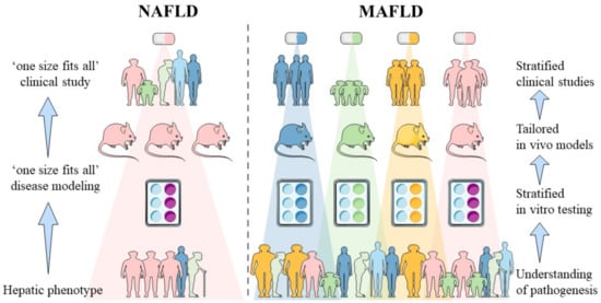 The diagnosis of MAFLD is made based on the presence of hepatic steatosis with at least one of three of the following features: (i) obesity/overweight, (ii) diabetes mellitus and/or (iii) evidence of metabolic dysregulation [,]. The origin of MAFLD is, however, unspecified and highly heterogeneous due to multiple coexisting disease-modifiers including sex, age, diet, alcohol consumption, concurring liver pathology, genetic background and metabolic pressure. Most patients suffering from NAFLD also meet the criteria for MAFLD. A recent cross-sectional study revealed that the NAFLD prevalence was 37.1% (95% CI, 34.0–40.4), whereas the MAFLD prevalence was slightly higher at 39.1% (95% CI, 36.3–42.1) in the general population of the United States of America []. As suggested by Eslam et al., novel clinical trial design will consist of stratified patient groups based on MAFLD etiology rather than inclusion based on histology and scoring systems []. Therefore, patient heterogeneity should also be adopted in preclinical disease modeling and drug screening studies. The impact of the change in terminology on different stages of drug development is visualized in Figure 1.