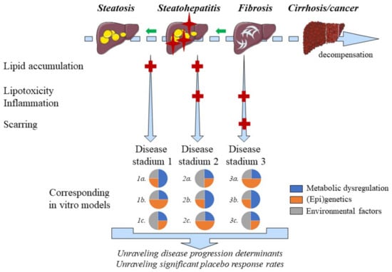 MAFLD is a naturally progressing and regressing disease, which may partly explain high placebo response rates in clinical studies. In vitro models are well-positioned to study the MAFLD disease course, which seems key for unraveling the determinants of disease progression, regression and hence high placebo response rates (Figure 2) []. Hepatic steatosis is considered to precede inflammation across the spectrum of MAFLD. Yet, inflammation may also precede lipid accumulation [], which is in conflict with traditional presumptions. Using iPSC-derived hepatic cells it was demonstrated that thapsigargin-mediated induction of ER-stress is an important driver of lipogenesis [] and a pathway that should be considered when modeling steatosis-preceding inflammation. Stressed hepatocytes may accumulate lipids, which can easily be modelled in vitro using co-culture systems with macrophages and/or stellate cells []. Yet, increasing complexity, which is typical in co-cultures, goes along with decreased large-scale applicability. Therefore, conditioned media of independent cell cultures could be used for testing the interplay between cell types and the reciprocal effects. Alternatively, specific compounds that activate NASH promoting-pathways can be added to the cell culture media. Nonetheless, direct cell–cell contacts and thus co-culture models will be necessary to study novel, unknown processes related to steatosis-preceding inflammation and defining determinants of MAFLD progression [].