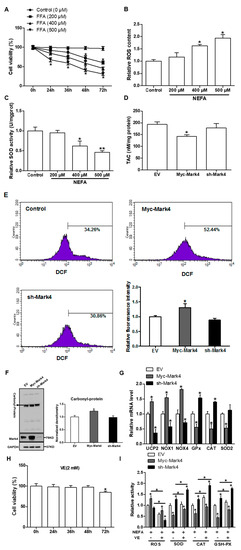 MARK4 promotes oxidative stress in pig primary trophoblast cells. (A) Primary cytotrophoblasts isolated from pig placentas were cultured and incubated for 0, 24, 36, 48, and 72 h in the presence of 200, 400, or 500 μM NEFA. Cell viability was detected by CKK-8 (n = 3). (B,C) The relative ROS (B) and SOD (C) activity of the primary cytotrophoblasts incubated for 24 h in the presence of 200, 400 or 500 μM NEFA (n = 3). (D) Total antioxidant capacity (TAC) was measured in primary trophoblast cells after transfection with Myc-MARK4 and sh-MARK4 for 48 h. Cells were then incubated with 400 μM NEFA for 24 h (n = 3). (E) ROS content, evaluated by DCF production using flow cytometry or a spectrophotometer (n = 3), respectively, in pig cytotrophoblasts after transfection with Myc-MARK4 and sh-MARK4 for 48 h. Before assessment of ROS generation, cells were incubated with 400μM NEFA for 24 h. Value in scale bar depicts the percentage of DCF-positive cells. (F) Representative immunoblots and densitometric quantification for total protein carbonylation (n = 3). (G) Relative mRNA expression of oxidant stress-related genes after transfection with Myc-MARK4 and sh-MARK4 for 48 h in cytotrophoblasts. Cells were then treated with 400 μM NEFA for 24 h (n = 3). (H) Isolated primary trophoblast cells were cultured and incubated for 0, 24, 36, 48, and 72 h in the presence of 2 mM VE. Cell viability was detected by CKK-8 (n = 3). (I) Relative activity of ROS, SOD, CAT, and GSH-PX after transfection with Myc-MARK4 and sh-MARK4 for 48 h in trophoblast cells. Before the assessment, cells were incubated with 400 μM NEFA or 2 mM VE for 24 h (n = 3). Results are expressed as mean ± SEM. ** p < 0.01; * p < 0.05 compared with the control group. ROS: reactive oxygen species; DCF: dichlorofluorescein; SOD: superoxide dismutase; GSH-PX: glutathione peroxidase; CAT: catalase; NEFA: non-esterified fatty acid; Myc-MARK4 group: over expression of MARK4 group; sh-MARK4 group: knock down of MARK4 group; Control: empty vector (EV) group.