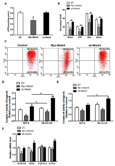 MARK4 blocks mitochondrial oxidative respiration in pig primary trophoblast cells challenged with 400 μM NEFA. (A) Mitochondrial ATP production after transfection with Myc-MARK4, sh-MARK4 for 48 h in cytotrophoblasts. Before assessment of ATP generation, cells were incubated with 400 μM NEFA for 24 h (n = 3); (B) Mitochondrial respiratory parameters were measured in pig cytotrophoblasts after transfection with Myc-MARK4, sh-MARK4 for 48 h. Cells were then treated with 400 μM NEFA for 24 h (n = 3). Oxygen consumption rate (OCR) measurements were normalized to total protein level of whole cell lysates extract (pmol O2/μg protein); (C) Impaired mitochondrial function was estimated by JC-1 fluorescent staining using flow cytometry in cytotrophoblasts (n = 3). The upper right (UR) quadrant depicts the percentage of FL-2 (red channel)-positive cells (high mitochondrial membrane potential) and the lower right (LR) quadrant depicts the percentage of FL-2 (red channel)-negative cells (depolarized mitochondrial membrane potential); (D,E) The activity of mitochondrial complexes I (D) and III (E) in pig trophoblast cells after transfection with Myc-Mark4, sh-Mark4 for 48 h. Cells were then treated with 400 μM NEFA or 2 mM VE for 24 h (n = 3); (F) mRNA levels of mitochondrial complexes I (NDUFB8), II (SDHB), III (UQCRC2) and V (ATP5α) (n = 3). Values are expressed as mean ± SEM. ** p < 0.01; * p < 0.05 compared with the control group. NEFA: non-esterified fatty acid; VE: Vitamin E; Myc-MARK4 group: over expression of MARK4 group; sh-MARK4 group: knock down of MARK4 group; Control: empty vector (EV) group.
