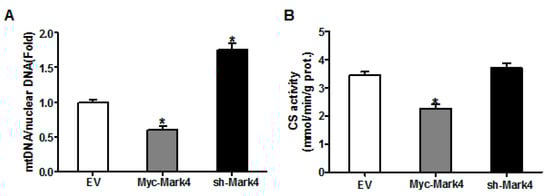 We next investigated the effects of MARK4 on mitochondrial density in pig placental trophoblast cells. As shown in Figure 3A, the ratio of mitochondrial DNA (mtDNA) to nuclear DNA was significantly decreased in Myc-MARK4 group compared to vector control group, while sh-MARK4 treatment increased mtDNA copy number (p < 0.05). In agreement, elevated MARK4 inhibited the citrate synthase (CS) activity (an indicator of mitochondrial content) compared with vector control group (p < 0.05, Figure 3B). Concerning mitochondrial biogenesis, we evaluated mitochondrial density assessed by MitoTracker Red fluorescent staining. As illustrated in Figure 3C,D, mitochondrial density was lower in Myc-MARK4 group than in vector control group (p < 0.05); this result was also confirmed by transmission electron microscopy, which indicated that the amount of mitochondria in cytotrophoblasts following 36 h exposure to FA was reduced (44% decrease, p < 0.05) in Myc-MARK4 group compared with vector control group (Figure S2A,B). Furthermore, the mRNA levels of mitochondria-encoded genes, including, ND1, CYTB, COX1 and ATP6, were significantly decreased in Myc-MARK4 group compared to the control group (p < 0.05 or p < 0.01, Figure S2C). To gain further insight into the mechanisms by which elevated MARK4 decreased mitochondrial content in pig trophoblast cells challenged with FA, we measured the mRNA levels of genes involved in mitochondrial biogenesis or mtDNA replication and repair. As shown in Figure 3E, the mRNA expression of PGC1α, DNA polymerase subunit 1 (POLG1) and 2 (POLG2) and single-strand DNA binding protein 1 (SSBP1) was lower in Myc-MARK4 group than in vector control group (p < 0.05).