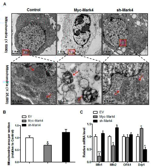 Having determined that mitochondrial density was reduced following Myc-MARK4 + FA treatment, we next addressed whether there was an alteration of mitochondrial structure in response to elevated MARK4. As illustrated in Figure 4A,B, the area of mitochondria was decreased (31% reduction, p < 0.05) in Myc-MARK4 group compared with vector control group. Higher magnification (×25,000) further revealed that overexpression of MARK4 negatively altered mitochondrial structure in cytotrophoblasts marked by swollen mitochondria associated with fewer cristae and a decreased electron density of the matrix. Concerning the regulation of mitochondrial dynamic network (maintaining normal mitochondrial morphology), we determined the mRNA levels of genes involved in mitochondrial fission and fusion, including mitofusin 1 (Mfn1), mitofusin 2 (Mfn2), optic atrophy type 1 (OPA1) and Dynamin 1 (Drp1), which contribute to this process [29]. As shown in Figure 4C, elevated MARK4 induced a decrease (p < 0.01 or 0.05) in the mRNA content of Mfn1 and Mfn2 (regulating mitochondrial fusion), whereas the mRNA expression of Drp1 (regulating mitochondrial fission) was increased in Myc-MARK4 group compared with the control group (p < 0.05). Moreover, the mRNA level of OPA1 (regulating mitochondrial fusion) was not affected by overexpression of MARK4.