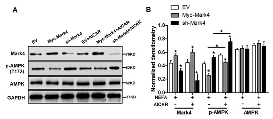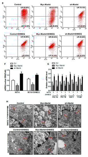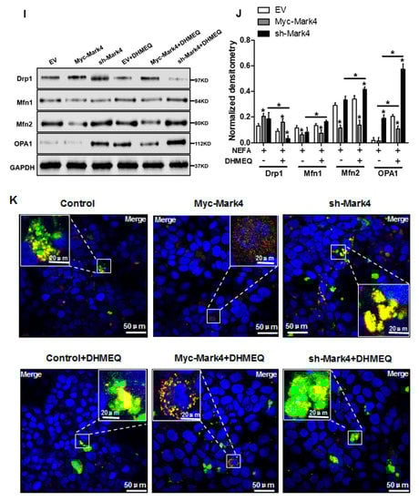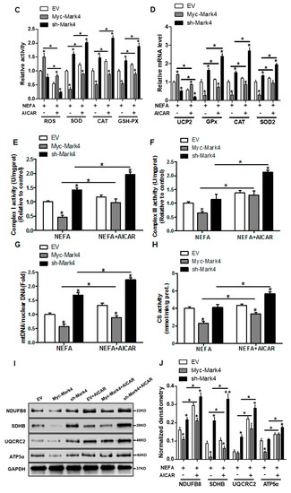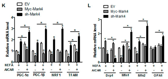 Consistent with decreased oxidative stress in Myc-MARK4 + AICAR treatment, the addition of AICAR promoted the activities of mitochondrial Complexes I and III in the Myc-MARK4 or sh-MARK4 group (p < 0.05, Figure 5E,F). Concurrently, Mitochondrial biogenesis indicated by mtDNA copy number, CS activity and mitochondrial density estimated by MitoTracker Red staining was significantly increased in the Myc-MARK4 or sh-MARK4 group following exposure to FA+ AICAR (p < 0.05, Figure 5G,H and Figure S3B,C), along with elevated protein contents of NDUFB8, SDHB, UQCRC2, and ATP5α (mitochondrial complexes) and increased mRNA expression of mitochondria-encoded genes, including ATP6, CYTB, ND1, and COX1 (p < 0.05, Figure 5I,J and Figure S3D). Moreover, transmission electron microscopy clearly showed that the addition of AICAR for 36 h positively altered a mitochondrial structure (reduced mitochondrial swelling and disruption) in Myc-MARK4 or sh-MARK4 group (Figure S3E). In agreement, the mRNA levels of genes involved in mitochondrial biogenesis, including PGC1α, PGC1β, NRF1, and TFAM, and of genes associated with regulation of mitochondrial morphology, including Mfn1, Mfn2, and OPA1, were higher in the Myc-MARK4 or sh-MARK4 groups after 24 h exposure to FA+ AICAR treatment, along with decreased mRNA content of Drp1 (p < 0.05, Figure 5K,L).