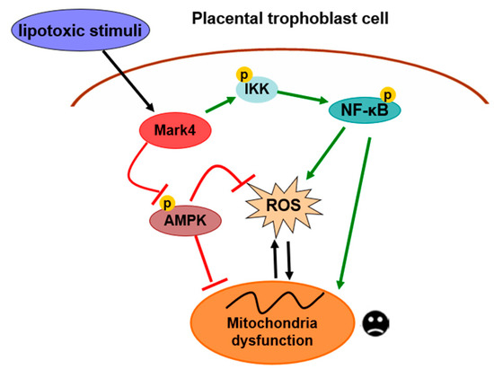In summary, our present study demonstrates that MARK4 stimulates oxidative stress and incites mitochondrial abnormalities in porcine trophoblast cells upon the status of lipotoxic insult, which could contribute to placental dysfunction in conditions associated with excessive back-fat during pregnancy of sows. Moreover, both AMPK and NF-κB signals are involved in MARK4 activated oxidative stress and mitochondrial dysfunction in pig placental trophoblasts (Figure 7). Thus, our results indicate that MARK4 has potential as a regulator of mitochondrial injury associated with excessive back-fat in the pig placenta, and anti-MARK4 therapy targeted to inhibit oxidative stress and mitochondrial injury in cytotrophoblasts may serve as a novel therapeutic strategy for treatment of obesity-associated pregnant complications.