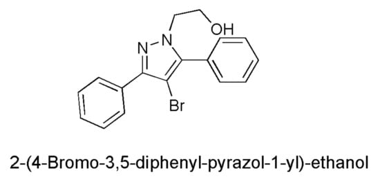 Concerning the development of new antibacterial drugs, active where common antibiotics no longer work, the five-membered heterocyclic diazole ring of pyrazole has been shown to have numerous biological activities, including antimicrobial effects [,]. The pyrazole derivatives are mainly of synthetic derivation, and only a few molecules containing the pyrazole nucleus are of natural origin. In this regard, the first example of a natural product containing the pyrazole ring, endowed with anti-diabetic activity, was the amino acid L-α-amino-β-(pyrazolyl-N)-propanoic acid [(S)-β-pyrazolyl alanine], isolated in 1957 from the Citrullus vulgarisin juice of watermelon []. The pyrazole nucleus possesses almost all kinds of pharmacological activities, but, while several of its medicinal properties have been reported since the year 1944, the first studies reporting the antimicrobial effects of the pyrazole derivatives have been published much more recently, particularly after the year 2000 [,]. Consequently, the 2-(4-bromo-3,5-diphenyl-pyrazol-1-yl)-ethanol (BBB4, Figure 1), synthetized for the first time by Bondavalli et al. and found to be active as an analgesic, hypotensive, anti-inflammatory, local anaesthetic, inhibitor of motor activity in mice and rats, and as an antiplatelet aggregative agent in vitro in 1998 [], has never been studied for its possible antimicrobial properties.