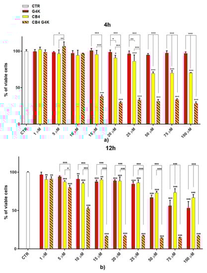 To visualize the cytotoxicity profiles of the three samples, they are represented with bar graphs in Figure 2. To obtain dispersion graphs, the data of the cell viability (%) at 4, 12, and 24 h were graphed vs. the concentrations tested for the G4K, BBB4, and BBB4-G4K NPs. The curves of the cell’s viability (%), as a function of the compound’s concentrations, were obtained and are available in Figure S7, Section S2.2 in the Supplementary Materials.