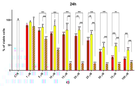 Concerning the cytotoxicity studies, the statistical significance of differences between the experimental and control groups and between the different samples was determined via a two-way analysis of variance (ANOVA) with the Bonferroni correction. The analyses were performed with Prism 5 software (GraphPad, La Jolla, CA, USA). Asterisks indicate the following p-value ranges: * = p < 0.05, ** = p < 0.01, *** = p < 0.001. Concerning the MIC values, experiments were made in triplicate and the concordance degree was 3/3 and the ±SD was zero.