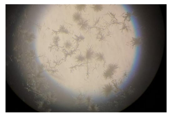 As can be seen in Figure 2, for all the compounds the cytotoxic effects were both time- and dose-dependent. Let us first consider the two ingredients, G4K and BBB4. As expected, the cytotoxic profile of the empty dendrimer G4K conformed to that observed by us previously after both 4, 12, and 24 h []. Particularly, after 4 h of exposure, at concentrations of 5–100 µM, the G4K was the least toxic compound, with no significative difference in cell viability compared to the control, even at the maximum concentration tested (100 µM, cell viability 97.2%). The G4K was slightly more cytotoxic after 12 h of incubation at 1–25 µM concentrations, while its cytotoxicity improved significantly for higher concentrations, but the cell viability remained >50%, even at 100 µM concentrations (53.3%). After 24 h of exposure, the cytotoxic effects of G4K increased further, and a significant difference in cell viability compared to the control was observed even at the minimum concentration tested (1 µM). Cell viability was maintained at >50% to a concentration of 25 µM (59.3%), while it decreased dramatically for higher concentrations, reaching the 23.1% at 100 µM. The pyrazole derivative BBB4 exerted cytotoxic effects comparable to those of G4K, or slightly higher, resulting in non-cytotoxicity up to a concentration of 15 µM after 4 h of exposure. Its cytotoxicity increased progressively at 20, 25, and 50 µM (viability cells of 90.9, 86.4, and 70.5%, respectively), while at over 50 µM it remained unchanged. After 12 h of exposure, the BBB4, while slightly more cytotoxic than the G4K up to a concentration of 10 µM, at higher concentrations it displayed a cytotoxicity comparable to that of G4K (15–50 µM), or significantly lower (75–100 µM). Notably, at a BBB4 100 µM concentration, the cell viability was 66.9%, while that observed for the G4K was 53.3%. After 24 h of cell exposure to BBB4, the detected cytotoxicity was lower than that observed for G4K at all the concentrations tested, but the cell viability was <50% from the concentration of 50 µM (45.9%). Moreover, as observed after 12 h of exposure, the cell viability did not change significantly for higher BBB4 concentrations. As for the BBB4-G4K NPs, the results obtained were very different from those observed for the NPs made of the same dendrimer G4K but loaded with ursolic acid (UA-G4 NPs) and those of the recently published []. In that study, the encapsulation of UA in G4K led to a reduction in the intrinsic cytotoxicity of the two ingredients, resulting in UA-loaded NPs significantly less cytotoxic than the two compounds when administered alone []. On the contrary, in this case, after 4, 12, and 24 h of exposure, and depending on the time of the experiments, a dramatic improvement in the cytotoxic effects of the BBB4-G4K NPs was observable starting from the 15 µM concentration, resulting in a reduction in cell viability below 50% [cell viability of 38.0% (4 h), 16.5% (12 h), and 13.7% (24 h)]. For higher concentrations of BBB4-G4K NPs, the cell viability remained essentially unchanged. For lower concentrations, the BBB4-G4K NPs exerted a cytotoxicity comparable to or lower than that of the G4K and BBB4 after 4 h of exposure, comparable (at 1 µM concentration) or increasingly higher after 12 h, and always higher after 24 h of exposure. Overall, it might seem that this time the nanotechnological manipulation of BBB4, with the same G4K dendrimer previously employed with totally different results, has led to a substantial improvement in the cytotoxicity of the two ingredients. In effect, this early deduction is incorrect as the high cytotoxicity observed for the BBB4-G4K NPS is not due to the nano-formulation but to the high amount of BBB4 that the BBB4-G4K NPs contain (28.8%) and that the BBB4-G4K NPs release (95.5%) according to their DL% and release profile []. Practically, the HaCaT cell death was not caused by the BBB4-G4K NPs but by the BBB4. Note that at the 15 µM concentration critical for cells, the amount of free BBB4 released in the medium corresponded to the concentrations of 173.4, 239.9, and 254.7 µM after 4, 12, and 24 h of exposure, respectively. Such concentrations are 1.7-, 2.4- and 2.5-fold higher than the maximum concentration of BBB4 tested, which after 24 h of exposure killed 60% of the cells. Moreover, at such high concentrations, the BBB4 released tended to precipitate into the medium, forming macro-crystals that disturbed the cells with a non-specific mechanical action, probably damaging irreparably their cytoplasmic membrane. In this regard, Figure 3 shows the macro-crystals formed by BBB4 released in the medium at a concentration of 15 µM.