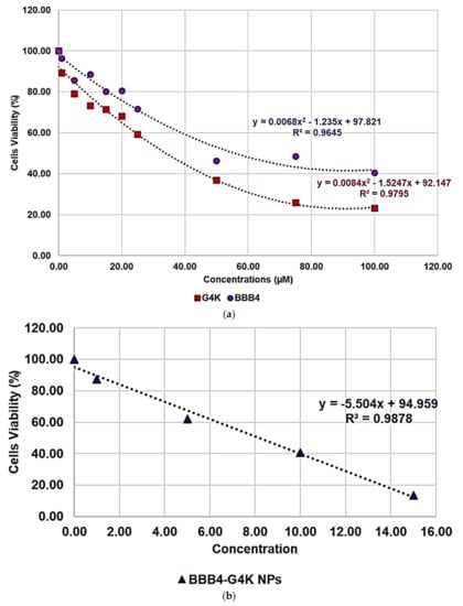 Regression models that better fit the dispersion graphs obtained, reporting in the graph the cell viability% vs. the concentration of samples at 24 h of exposure of BBB4 and G4K (a) and of BBB4-G4K NPs (b).