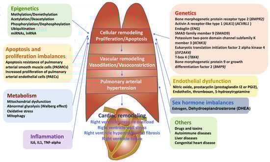 The pathology of PAH is coordinated with many molecular mechanisms including genetic and epigenetic dysregulation, apoptosis resistance and dysfunction of pulmonary arterial endothelial cells (PAECs), increased proliferation of pulmonary arterial smooth muscle cells (PASMCs), inflammation, DNA damage, metabolic diseases, sex hormone disorders, and oxidative stress [] (Figure 1).