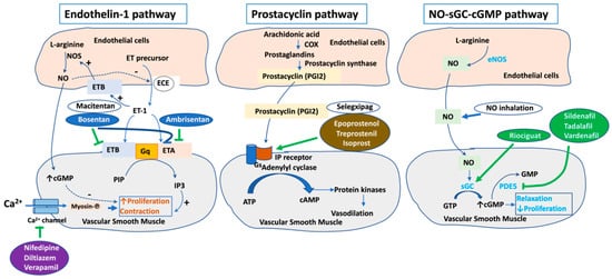 Furthermore, phosphodiesterase inhibitors including sildenafil (Revatio), vardenafil (Levitra), and tadalafil (Adcirca), also acting on the NO-cGMP signaling pathway as pulmonary vasodilators, have also been applied for patients with PAH []. Phosphodiesterase-5 (PDE5) catalyzes the conversion of cGMP to GMP. cGMP relaxes the smooth muscle cell by decreasing intracellular calcium level. Therefore, by inhibiting PDE5, sildenafil, vardenafil, and tadalafil increase the availability of cGMP, resulting in efficient vasodilation. Side-effects of phosphodiesterase inhibitors are headache, flushing, dyspepsia, and visual disturbances [].