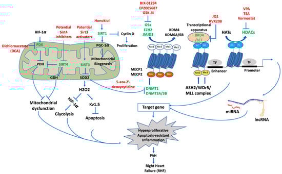Potential epigenetic therapeutic targets for PAH. Targeting epigenetic modifications that involve PAH pathogenesis and right-heart failure to develop drugs for the treatment of PAH. Epigenetic mechanisms including demethylation of typical methylation motifs histone 3 lysine 27 trimethylation (H3K27me3) and histone 3 lysine 9 trimethylation (H3K9me3), DNA methylation, methylation of histone 3 lysine 4 (H3K4), and acetylation and deacetylation of histone lysine residues, as well as miRNAs and lncRNAs, in PAH affect chromatin packaging, accessibility, and gene expression and permit transcriptional elements and transcription apparatus to modulate gene transcription. Activation of enzymes, such as methyltransferases, demethylases, acetyltransferases, and deacetylases, is required for transitional states of chromatin for regulating gene expression. Sirtuins regulate apoptosis, glycolysis shift, and mitochondrial biogenesis in PAH. These processes lead to hyperproliferation, apoptosis resistance, and inflammation of PASMCs and PAECs, resulting in PAH pathology and ultimately right-heart failure. Epigenetic modifications that have been targeted for drug treatment of PAH are shown in green. Epigenetic modulators that were experimentally tested and potential modulators are listed in red. Me3, trimethylation; Me. methylation; Ac, acetylation.