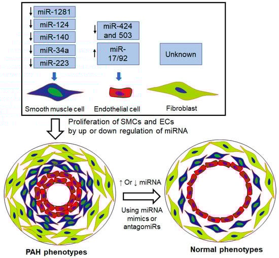The expression of miRNA is one of the major mechanisms for epigenetic regulation [,]. Since gene expression is governed by miRNAs via a decrease in the translation of target mRNAs, they play a major role in PAH, a disease that is characterized by excessive proliferation and resistance to apoptosis of PASMCs, PAECs, and pulmonary arterial adventitial cells (PAADCs). Mounting evidence has established the role of dysregulated miRNAs in the hyperproliferative and apoptosis-resistant phenotype of pulmonary vascular cells, including PAECs and PASMCs, in various PAH models []. Several major dysregulated miRNAs are involved in PAH pathogenesis, as shown in Table 2.
