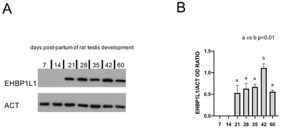 EHBP1L1 protein level during the first wave of rat spermatogenesis. (A): Western blot analysis showing the expression of EHBP1L1 (164 kDa, top section) and ACTIN (42 kDa, bottom section) during rat testis post-natal development at 7, 14, 21, 28, 35, 42, and 60 days postpartum (dpp). (B): Histogram showing the relative expression levels of EHBP1L1 in all the analyzed samples. Data were normalized with ACTIN and reported as EHBP1L1/ACT OD ratio. All data represent the mean ± SEM. a vs. b: p < 0.01. Western blot experiment was performed in triplicate.