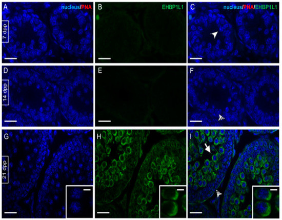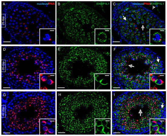 At this stage, EHBP1L1 became localized in the perinuclear cytoplasm of SPC (arrow; Figure 4C) and rSPT (dotted arrow; Figure 4C and inset), with a more outlined appearance compared to that observed at 21 dpp, in which it was more diffused. SPG continued to be negative (striped arrowhead, Figure 4C). In 35 dpp tubules (Figure 4D–F), it was possible to identify the rSPT (dotted arrow; Figure 4F and inset), wherein acrosome began to enlarge and flatten on the nuclear surface, and an EHBP1L1 signal was detectable, with a perinuclear localization close to the forming acrosomal region. Then, at 42 dpp (Figure 4G–I), the protein retained its localization in SPC (arrow; Figure 4I) and rSPT (dotted arrow; Figure 4I and inset).