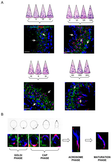 Moreover, spermatozoa (SPZ) possessing a normal acrosome are favored in fertilization; it has been demonstrated that intra-cytoplasmic insemination experiments using SPZ with an abnormal acrosome resulted in unsuccessful fertilization [3,4,5], highlighting that this organelle is fundamental for reproductive efficacy. Consequently, acrosome biogenesis (AB) is also extremely important. Acrosome formation that is comprehensive of four characteristic phases (the Golgi, the cap, the acrosome and the maturation phases), takes place during spermiogenesis, the differentiative process that leads round spermatids (rSPT) to form elongated SPT (eSPT); finally, to obtain mature and qualitatively functional SPZ, each step must be realized and controlled in a precise manner by genes that are activated and/or repressed in specific cells and stages [6].