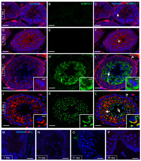 Thus, to confirm this assumption and to amplify the knowledge about EHBP1L1 and its biological role in spermatogenesis, in this paper, we evaluated its protein expression and localization together with acrosome and actin. The analysis was performed during the first wave of rat spermatogenesis, which represents a good model that, due to the gradual appearance and differentiation of the several cell types composing the seminiferous epithelium, allows for the obtainment of localization profiles—cell- and stage-specific—of genes and proteins involved in this process.