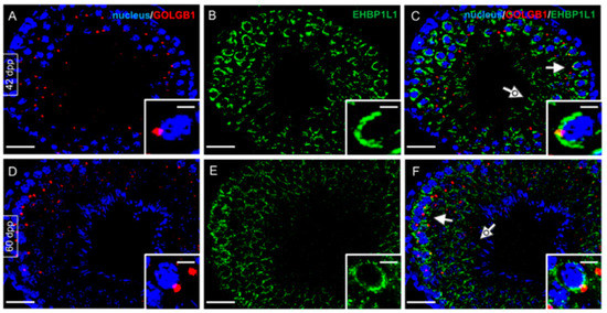 EHBP1L1 localization analysis was also extended using GOLGB1, a marker of the Golgi apparatus, in 42 dpp (Figure 8A–C), the stage in which the highest level of EHBP1L1 was detected, and in 60 dpp (Figure 8D–F), which represents the most mature stage wherein all the germ cells can be identified. As previously observed, EHBP1L1 retains its localization in the perinuclear cytoplasm of SPC (arrow; Figure 8C,F) and rSPT (dotted arrow; Figure 8C,F and insets) surrounding the Golgi region, which appears as a red dot. eSPT was negative for both proteins (asterisk, Figure 8F).