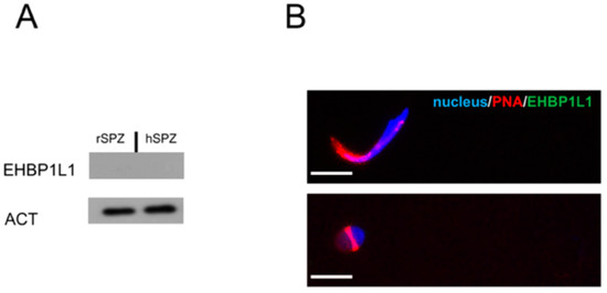 Finally, to confirm the absence of EHBP1L1 in male gametes, a Western blot (Figure 10A) and immunofluorescence (Figure 10B) analysis were carried out on rat epididymal SPZ. Both the analyses revealed the total absence of the signal for EHBP1L1, indicating that they were eliminated from the SPZ prior to their spermiation.
