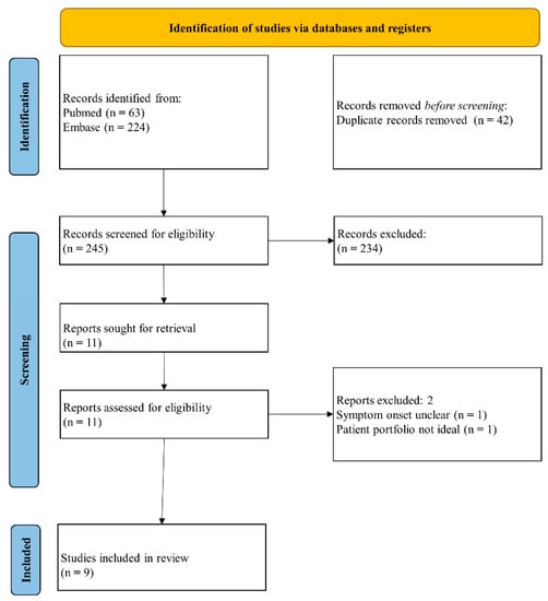 Our search of Pubmed and Embase retrieved 63 and 224 articles, respectively. After removing 42 duplicates, we screened the titles and abstracts of 245 studies, among which 11 articles met our inclusion criteria. We performed a full-text evaluation of these articles, and two articles were further excluded: one because of unclear duration from symptom onset [16] and the other because it targeted patients with vitamin D deficiency, which was not the focus of our study [17]. Ultimately, nine studies were eligible for inclusion in our meta-analysis [13,14,15,18,19,20,21,22,23]. The study selection process is illustrated in Figure 1.