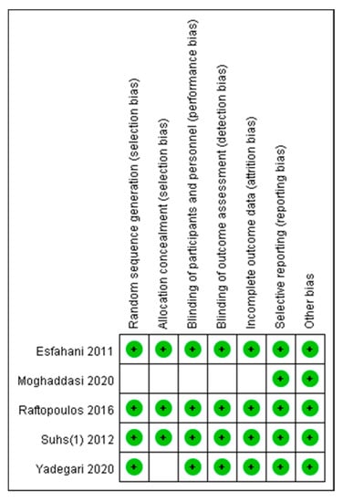 The methodological quality of the included RCTs is summarized in Figure 2. Five trials were described as RCTs, each reporting an acceptable method of randomization [13,14,15,18,21]. All RCTs described the generation of random sequences with computer software or number tables and emphasized allocation concealment during randomization, except for the studies of Moghaddasi et al. [21] and Yadegari et al. [14]. Four trials conducted double-blinding of the participants, personnel, and outcome assessors, but the study of Moghaddasi et al. [21] lacked an explanation of their blinding procedure. Double-blinding of the participants and personnel was achieved by providing drugs and placebos with an identical appearance. Only the study of Moghaddasi et al. was ranked as unknown risk because the number of patients lost to follow-up was not mentioned [21]. All studies were ranked as low risk in terms of reporting bias and other bias. The two cohort studies had a score of 9 on the Newcastle–Ottawa scale, demonstrating a low risk of bias from the studies [19,20].