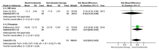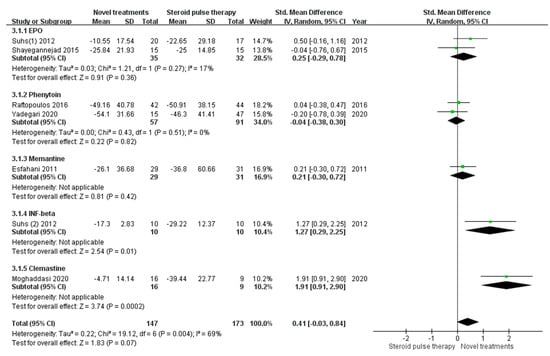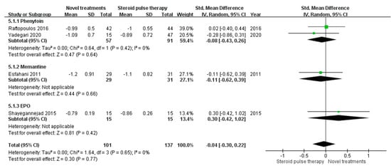 Our meta-analysis compared the effects of intravenous corticosteroid treatment and novel add-on treatments on RNFL thickness before and after therapy. When we chose the RNFL thickness of the affected eye as the baseline, there was no significant neuroprotective effect in the EPO and phenytoin treatment groups. The two studies involving EPO had different designs, with an I2 of 19%. Suhs et al. conducted an RCT with a follow-up period of 16 weeks and showed that RNFL thinning was less apparent after EPO treatment [13]; however, Shayegannejad et al. identified no significant difference between EPO and intravenous methylprednisolone treatment in a cohort study with a follow-up period of 6 months [20]. The overall effect of EPO treatment revealed no significant difference in neuroprotection compared with conventional steroid treatment. Further studies are required to ascertain a suitable follow-up period for determining the effect of EPO treatment on patients with acute optic neuritis. The two studies investigating phenytoin were both RCTs, with similar treatment and control groups [14,15]. However, the overall effect was also not significant, with an I2 of 0%. When we pooled the data from different novel treatment options, RNFL thinning tended to be less apparent in the novel treatment group, but the difference was not statistically significant. Besides, a high level of heterogeneity was observed across these studies.