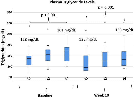 The statistical design of this pilot trial was explorative and descriptive. The baseline characteristics are specified as numbers (percentages) in cases of categorical variables and as means (standard deviations) in cases of continuous variables. The area under the curve (AUC) analysis concerning the fat-tolerance testing was calculated by the trapezoid approximation (AUC(T0−4) = AUC(T0−2) + AUC(T2−4); AUC(T0−2) = (Value(T0) + Value(T2))/2 × (Time(T2)-Time(T0)), AUC(T2−4) = (Value(T2) + Value(T4))/2 × (Time(T4)-Time(T2)). Changes between baseline and week 10 were tested with the paired-samples t-test and/or related samples Wilcoxon signed rank test when Shapiro–Wilk analysis suggested non-parametric distribution. p-values ≤ 0.05 were considered significant. The SPSS 26.0 statistical program was used (SPSS Inc., Chicago, IL, USA).