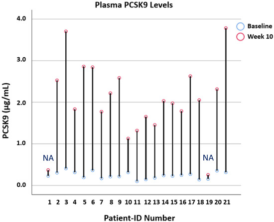 Lipoprotein lipase-regulating proteins did not change in response to treatment with alirocumab (Table 2 and Table 3). All patients with self-reported adherence showed a more than three-fold increase in circulating PCSK9 compared with their baseline examination. The plasma PCSK9 level increased from 0.25 to 2.24 µg/mL in the trial completion population, resulting in a mean change of +1.99 µg/mL (SD ± 0.68; p < 0.001; n = 19). The two non-adherent patients did not show an increase in circulating PCSK9 (<2-fold) and there was no LDL cholesterol reduction. Their PCSK9 levels remained <0.4 µg/mL, whereas, for all other adherent patients, these ranged between 1.1 and 3.8 µg/mL on alirocumab treatment. Among those participants with self-reported adherence, two patients did not show the expected decrease in LDL cholesterol, reflecting low/non-response to alirocumab treatment, but both had a 10- to 12-fold PCSK9 increase (Figure 2 and Figure S4, Table S3).