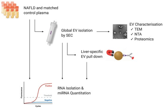 MicroRNAs (miRNA) are small non-coding RNA that have been shown to reflect disease-associated changes across numerous pathological conditions [12]. Altered expression of miRNAs that mediate pathways involved in lipid metabolism, inflammatory activation, and the development of fibrosis have been observed in tissue from individuals with NAFLD. The abundance of these miRNAs in blood has been postulated as potential biomarkers used to diagnosis and track NAFLD [13,14]. This approach potentially confers several advantages over liver biopsy. In addition to mitigating the risks of tissue biopsy, circulating miRNA analysis facilitates longitudinal evaluation of disease and potentially a more robust overview of disease stage. The stability of cell-free (cf) miRNA in blood is attributable to protection by RNA binding proteins, such as argonaute 2 (Ago2), high-density lipoproteins (HDL), or encapsulation within extracellular vesicles (EVs) [15].