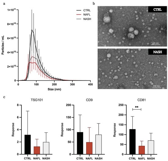 Characterisation of global circulating EV isolated from control, NAFL, and NASH subjects. (a) Particle concentration and size distribution by nanoparticle tracking analysis (NTA) (n = 5). Error bars denote SEM. (b) Representative TEM images of NASH patient and control global EVs. (c) Relative abundance of EV protein markers determined by mass spectrometry. Error bars denote SD. ** p ≤ 0.01.