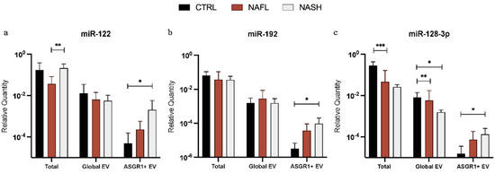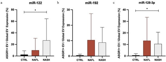 Relative expression of miRNA in liver-specific EVs. Expressions of miR-122 (a), miR-192 (b), and miR-128-3p (c) in asialoglycoprotein receptor 1 positive (ASGR1+) EVs as a percentage of global EVs in NAFL and NASH patients compared with controls. Statistical analysis performed by the Kruskal–Wallis test with Dunn’s for multiple comparisons. * p ≤ 0.05. Error bars represent standard deviation.