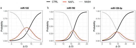 Ordinal logistic regression models. Ordinal regression applied to distinguish control, NAFL and NASH subjects using ASGR1+ EV-derived miR-122 (a), miR-192 (b), and miR-128-3p (c).