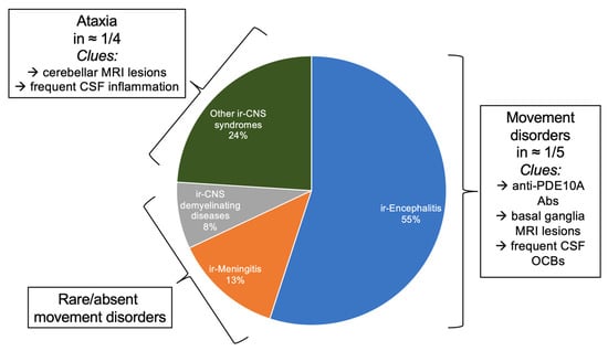 Immune-related adverse events of central nervous system associated with immune checkpoint-inhibitors. Figure is derived from observations of Marini et al. [43]. Ir-encephalitis represent 55% of cases, and movement disorders are associated in 1 out of 5 cases. Ataxia is present in 1 out of 4 cases of “Other ir-CNS syndromes”. Movement disorders are rare in other ir-related conditions. MRI, magnetic resonance imaging; CSF, cerebrospinal fluid; Anti-PDE10A Abs, antibodies anti phosphodiesterase 10A; OCBs, oligoclonal bands.
