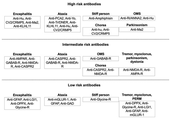 When dealing with movement disorders with an acute/subacute onset, in general, once other secondary causes were ruled out, clinicians should consider oncological diagnoses according to the clinical presentation. Brain malignancies are easily individuated through neuroimaging studies. Differently, paraneoplastic syndromes are more difficult to diagnose, as the neurological syndrome typically antedates the discovery of a systemic cancer. Conversely, for the ICIs-related movement disorders, the history of a systemic cancer treated with immunotherapy is the most important clue. In the case of brain tumors and paraneoplastic syndromes, the goal is the diagnosis and treatment of the underlying tumor when possible. In PNS, prompt initiation of drugs which acutely modulate the immune system is necessary (e.g., steroids or intravenous immunoglobulin as first-line, followed by cyclophosphamide or rituximab in nonresponsive cases). When dealing with n-irAEs, the withdrawal of ICIs followed by steroid treatment are often needed. In both PNS and n-irAEs, however, the first step is always to exclude other (more common) diagnoses, including direct neoplastic involvement (as in the case of carcinomatous meningitis, which can be difficult to demonstrate) or neuro-infectious conditions. In case of paraneoplastic conditions, the likelihood for a tumor to be the underlying cause of immune-mediated process is higher for conditions associated with onconeural antibodies (“high-risk “antibodies) compared to that of conditions associated with NSA (“intermediate-” or “low-risk” antibodies) [24]. This occurrence is relevant in the clinical practice. In fact, for a given clinical phenotype (for example, limbic encephalitis), the antibody’s type may suggest the possibility of having associated a cancer or not, thus directing the tumor search [28]. Typically, intracellular proteins derived from tumor apoptotic cell initiate the immune response in case of PNS and, therefore, most of the high-risk antibodies are directed towards antigens located in the nucleus or cytoplasm. A flow-chart with the main antibodies to be tested, based on the clinical picture and the related probability of having associated a neoplastic condition is proposed in Figure 2.