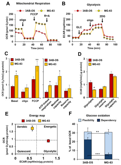 Comparative metabolic flux analysis of 3AB-OS and MG-63 cells, by using the Seahorse XFe96 Analyzer. (A) Representative profile of mitochondrial respiration stress test assay of 3AB-OS and MG-63 cells in basal condition, in presence of the ATP-synthase inhibitor oligomycin and after addition of the mitochondrial uncoupler FCCP. (B) Representative profile of glycolytic activity stress assay of MG-63 and 3AB-OS cells in presence of saturating amount of glucose (glycolysis), in presence of the glycolysis inhibitor 2-deoxyglucose (reserve), and after addition of the ATP-synthase inhibitor oligomycin (capacity). (C) Statistical analysis of the OCRs measured as in (A). Left panel: histograms showing basal OCR, OCR in the presence of oligomycin, OCR in the presence of FCCP; right panel: histograms showing ATP-linked respiration, maximal respiratory capacity and reserve capacity computed as described in Materials and Methods. The values are means ± SD of four independent experiments. * p < 0.05; ** p < 0.01. (D) Statistical analysis of the ECARs measured as in (B). The histograms show basal glycolysis, glycolytic reserve and glycolytic capacity as described in Materials and Methods. The values are means ± SD of four independent experiments. * p < 0.05. (E) Energy map was obtained plotting basal OCR versus basal ECAR of 3AB-OS and MG-63 cells. (F) Evaluation of mitochondrial glucose usage in 3AB-OS and MG-63 cells, expressed as percentage of basal OCR. Glucose dependency indicates cell reliance on the glucose oxidation pathway to maintain basal respiration. Metabolic flexibility to glucose is the ability of cells to compensate for the inhibition of the glucose oxidation pathway by oxidation of alternative substrates to fuel mitochondrial OxPhos. The values are means ± SD of three independent experiments. ** p < 0.01; *** p < 0.001. Abbreviations: oligo, oligomycin; FCCP, carbonyl cyanide 4-(trifluoromethoxy)phenylhydrazone; R, rotenone; A, antimycin A; GLC, glucose; 2DG, 2-deoxy-D-glucose; OCR, oxygen consumption rate; ECAR, extracellular acidification rate.