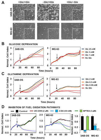 Effects of nutrient availability and metabolic pathway inhibition on osteosarcoma cell proliferation. (A) Phase-contrast images of 3AB-OS (upper panel) and MG-63 (lower panel) cultured for 48 h in three different conditions (from the left to the right): +Glc/+Gln, complete DMEM medium containing 25 mM glucose (Glc) and 2 mM glutamine (Gln); +Glc/−Gln, DMEM medium with 25 mM Glc, without Gln; −Glc/+Gln, DMEM medium with 2 mM Gln, without Glc. (B,C) Representative normalized cell index kinetics of 3AB-OS and MG-63 cells exposed to stepwise decrease in Glc or Gln concentration. Cells were grown in complete DMEM medium for approximately 24 h after seeding. Then medium was changed, and cells were treated for 72 h with DMEM medium containing different concentrations of Glc (B) or Gln (C) as indicated by the arrows. Each cell index value was normalized just before this starting point. (D) Normalized Cell Index traces of osteosarcoma cell lines incubated with either the glycolytic inhibitor 2-DG (50 mM) or the GLS1 inhibitor BPTES (2 µM) or the mitochondrial pyruvate carrier UK-5099 (2 μM) for 72 h. Cells were grown in complete DMEM medium and the day after treated with antimetabolites. The histogram (last graph on the right) displays different sensitivity to 2-DG or BPTES of 3AB-OS and MG-63 cells. NCI values have been normalized to the relevant control. Data are presented as mean ± SD; n = 3. Statistical significances are referred to control. *** p < 0.0001. Abbreviations: 2-DG, 2-deoxy-D-glucose; BPTES, N,N′-[thiobis (2,1-ethanediyl-1,3,4-thiadiazole-5,2-diyl)] bis-benzeneacetamide.