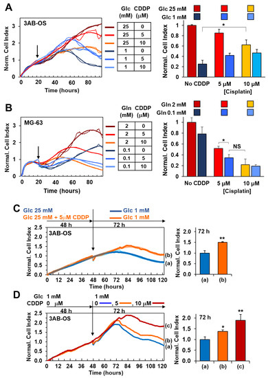 Cell viability effects of cisplatin combined with energy substrate deprivation. (A) Real-time monitoring of 3AB-OS cell growth after 72 h treatment with cisplatin in high (25 mM)/low (1 mM) glucose conditions. Cells were cultured under normal growth condition (DMEM medium with 25 mM Glc and 2 mM Gln) for approximately 24 h, and, after medium change, exposed to 5 and 10 µM cisplatin (CDDP) in complete DMEM medium supplemented with either 25 mM or 1 mM Glc. Panel on the left: representative NCI traces. Bar histogram on the right: NCI values normalized to controls represented by untreated cells (No CDDP), cultured under normal growth condition. Data are presented as mean ± SD of three independent experiments (biological replicates). * p < 0.05. (B) Real-time monitoring of MG-63 cells after 72 h treatment with CDDP in high (2 mM)/low (0.1 mM) glutamine conditions. Cells were cultured under normal growth condition (DMEM medium with 25 mM Glc and 2 mM Gln) for approximately 24 h, and, after medium change, exposed to 5 and 10 µM cisplatin in complete DMEM medium supplemented with either 2 mM or 0.1 mM Gln. Panel on the left: representative NCI traces. (B) Bar histogram: NCI values normalized to controls represented by untreated cells (No CDDP), cultured under normal growth condition. Data are presented as mean ± SD of three independent experiments (biological replicates). * p < 0.05. (C,D), antagonist effects of glucose shortage and cisplatin administration on 3AB-OS proliferation. (C) Response of CDDP-pretreated 3AB-OS cells to glucose shortage. Left panel, representative growth curves of 3AB-OS cells pretreated for 2 days in high glucose +/− 5 µM CDDP and then incubated in low glucose (without CDDP) for 72 h. Right panel, bar histogram: NCI values of CDDP-pretreated 3AB-OS cells relative to control (cells not pretreated with CDDP) after 72 h treatment. (D) Sensitivity of low-glucose pretreated 3AB-OS cells to CDDP. Left panel, representative growth curves of 3AB-OS cells pretreated with low glucose for 2 days and then exposed to CDDP (5 and 10 µM) or vehicle in low glucose nutrient medium for 72 h. Right panel, bar histogram: NCI values of low glucose-pretreated 3AB-OS cells relative to control (Glc 1 mM) after 72 h treatment. All data are presented as mean ± SD of three independent experiments. * p < 0.05; ** p < 0.01. Statistical significances are referred to the controls.
