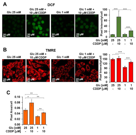 Cisplatin (CDDP) effects on ROS production and mitochondrial membrane potential in 3AB-OS under high and low glucose growth conditions. Cells were treated with the CDDP or vehicle at low and high glucose (Glc) as indicated and analysed after 48 h. (A) Laser scanning confocal microscopy (LSCM) of ROS production by the fluorescent probe dichlorofluorescein (DCF). Left panel shows representative LSCM images. Bar histogram on the right shows statistical analysis of the DCF pixel intensity/cell; values are means ± SD of three independent biological replicates; *** p < 0.001. Ten randomly chosen optical fields/sample each containing about 15 cells were analyzed by ImageJ. (B) LSCM analysis of mitochondrial transmembrane potential (ΔΨm) by the fluorescent probe TMRE (tetramethylrhodamine, ethyl ester). Left panel shows representative LSCM images. Bar histogram on the right shows statistical analysis of the TMRE pixel intensity/cell; values are means ± SD of three independent biological replicates; *** p < 0.001. Ten randomly chosen optical fields/sample each containing about 15 cells were analyzed by ImageJ. (C) Bar histogram showing the overall TMRE-related pixel area/cell; values are means ± SD of three independent biological replicates; * p < 0.05, ** p < 0.01.